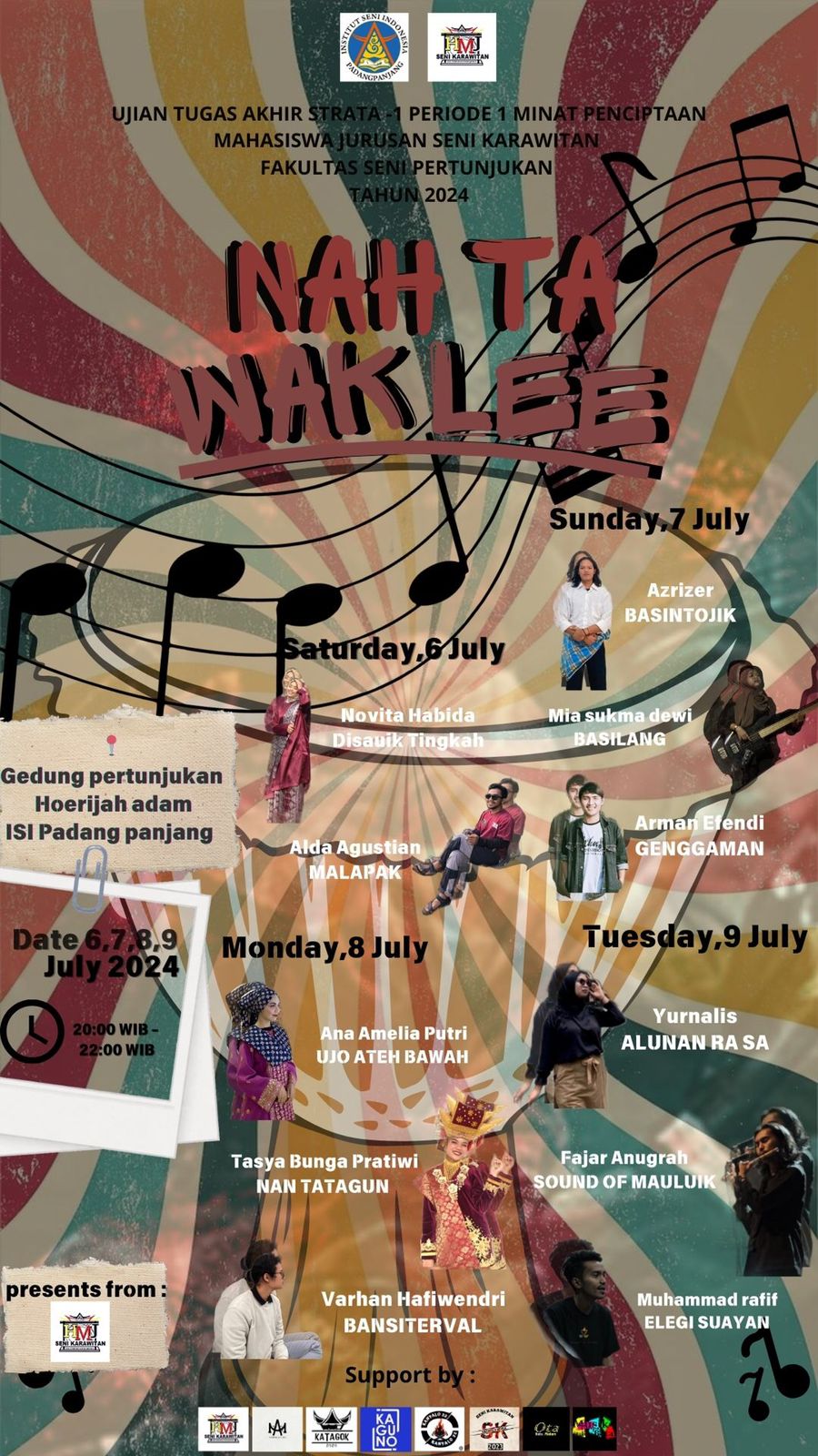 Padangpanjang, 6 Juli 2024 – Sebanyak 11 mahasiswa Prodi Seni Karawitan Institut Seni Indonesia (ISI) Padangpanjang akan menampilkan karya komposisi musik mereka dalam rangka ujian akhir. Pertunjukan ini berlangsung selama empat hari, dari tanggal 6 hingga 9 Juli 2024, bertempat di Gedung Pertunjukan Hoerijah Adam. Berikut adalah rincian acara yang telah dijadwalkan: