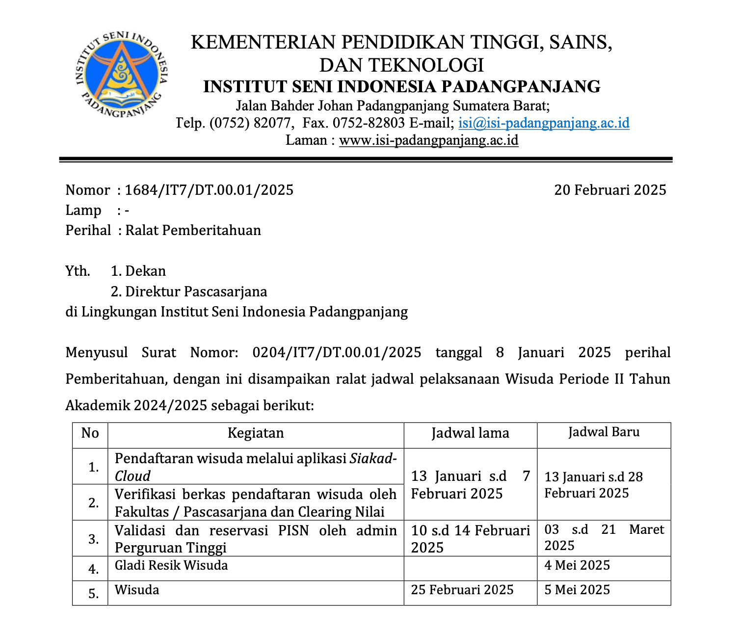 Pengumuman perubahan jadwal Wisuda Periode II Tahun Akademik 2024-2025Download