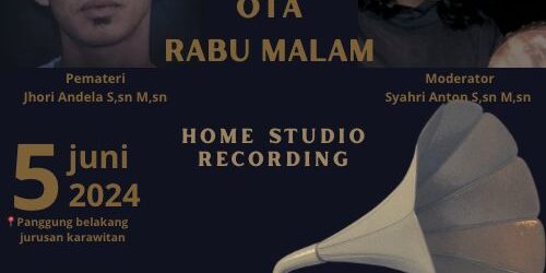 Pukul 20.00 WIB, suasana ruangan mulai hangat dengan kehadiran para peserta. Dari berbagai latar belakang, mereka bersiap-siap untuk terjun ke dalam dunia kreativitas musik modern. Memandu diskusi malam itu adalah Syahri Anton, seorang moderator yang biasa memandu acara diskusi-diskusi dalam acara Ota Rabu Malam. Di sampingnya, Jhori Andela, seorang alumni Prodi Seni Karawitan, siap memberikan wawasan tentang Home Studio Recording. Jhori, yang juga seorang dosen di prodi karawitan, telah mengukir prestasi dalam berbagai bidang seni, khususnya musik elektronik dan rekaman. Beberapa karya musik telah dihasilkannya melalui Home Studio Recordingnya yang dibangun dari awal karirnya masuk kedunia musik digital seperti karya musik Profile daerah, musik tari, musik teater, produksi lagu, komposisi musik dan terakhir juga aktif di dunia musik film. Film layer lebar “Onde Mande” yang disutradarai oleh Paul Agusta merupakan karya yang terbaru dari jhori yang dikerjakan di Home Studionya. Jhori dipercaya sebagai penata musik dalam film ini.